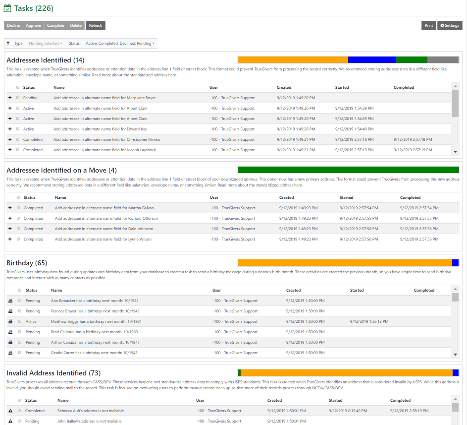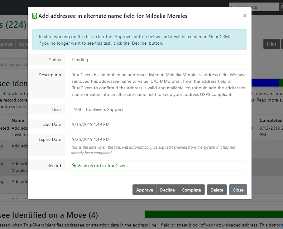 Remember, TrueGivers processes your database daily to look for new data matches to exiting accounts, new accounts, and accounts you made edits to. With each process, TrueGivers will create Stewardship tasks. These tasks are small actions that you can take on a specific record to improve data stewardship and ultimately your relationship with your donor.