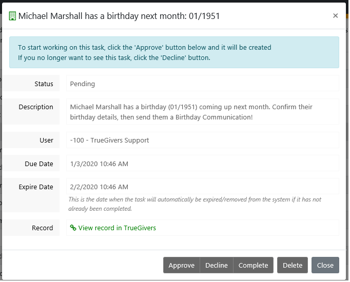 Jane Doe has an identified Birth Month/Year = 05/1970. On April 1, 2019, TrueGivers creates a Birthday Task for Jane Doe.