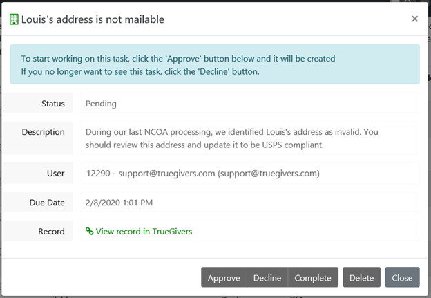 After you have determined what action you would like to take on the task, your first step is to review the data. Because TrueGivers uses third party data, you should always confirm the data provided is correct.