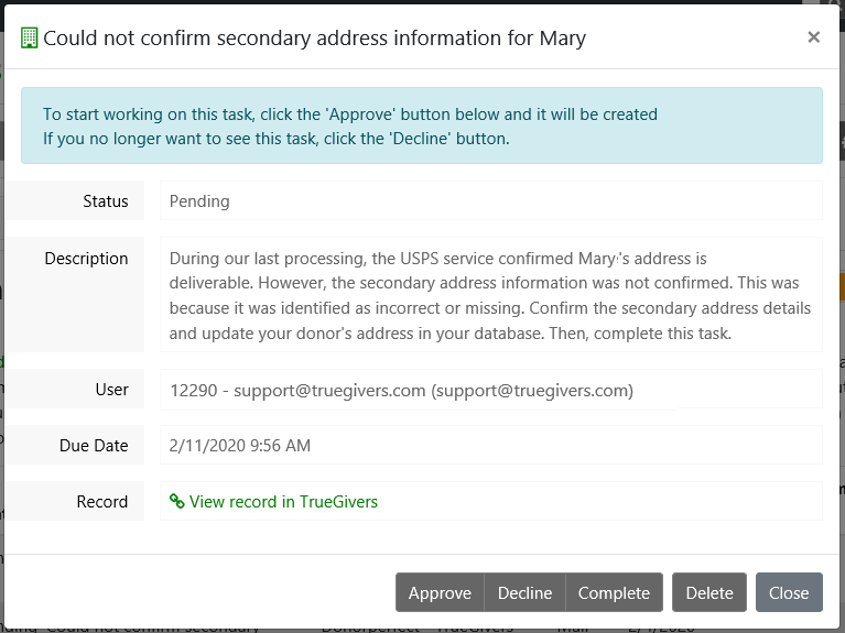 After you have determined what action you would like to take on the task, your first step is to review the data. Because TrueGivers uses third party data, you should always confirm the data provided is correct.